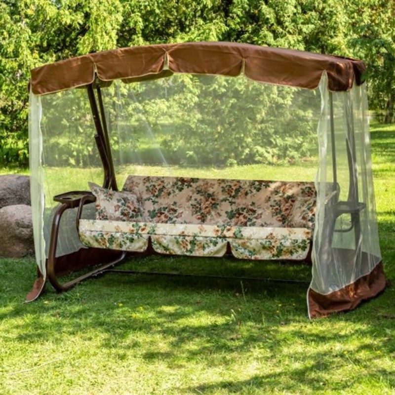 Конструкция качелей покрашена порошковой краской. Регулируемая, изготовленная из полиэстера крыша, защитит Вас от солнца.