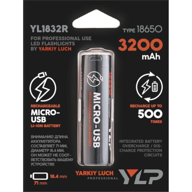 —Аккумулятор "Яркий Луч" YLP 1832R 18650, Li-lon 3.7B 3200mAh с защитой и встр. ЗУ micro-USB
