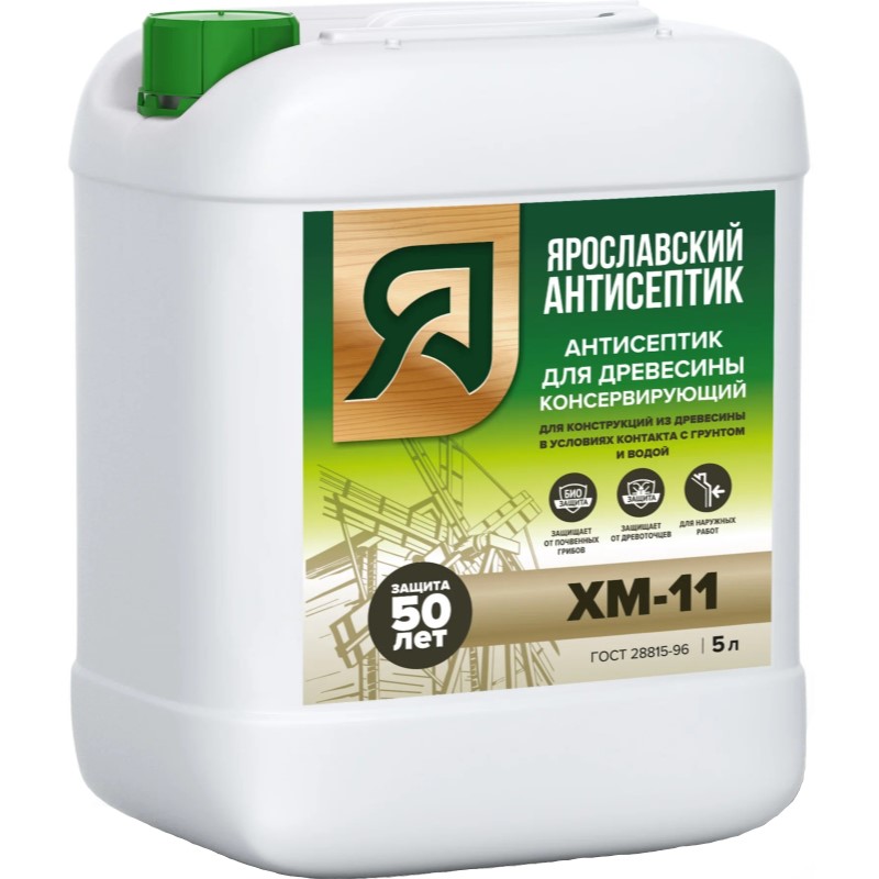 Антисептик ХМ-11 под торговой маркой «Ярославский антисептик» производится по ГОСТ 28815-96 «Растворы водные защитных средств для древесины» и предназначен для биологической защиты древесины от грибов (гниения, плесени, синевы) и насекомых-древоточцев при постоянном прямом контакте дерева с водой и грунтом. ХМ-11 особенно эффективен против почвенных грибов.