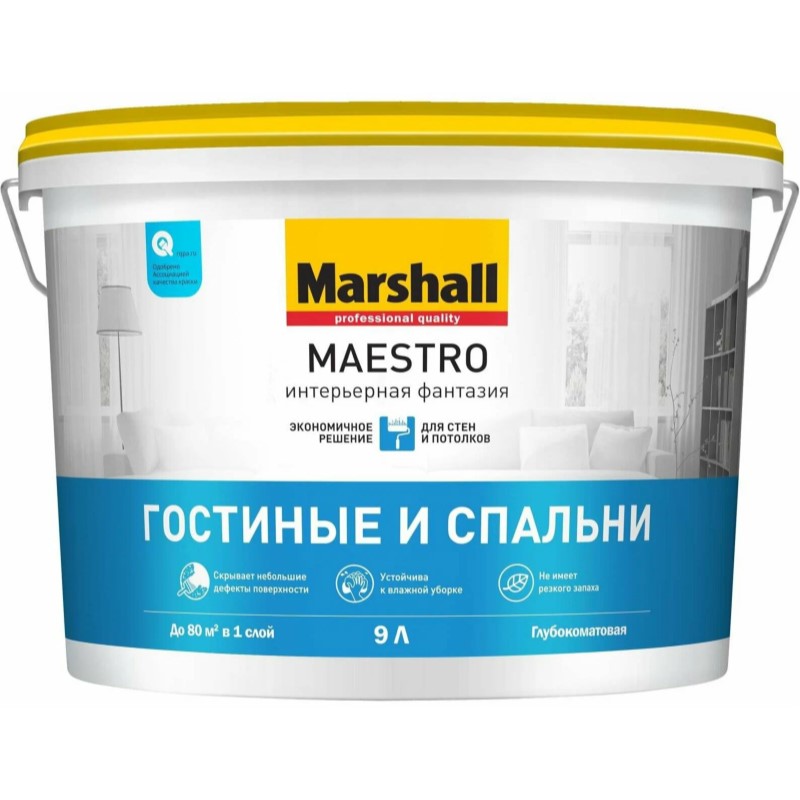 Для внутренних работ. Подходит для нанесения на полностью просохшие минеральные поверхности (бетон, штукатурка, кирпич и т. п.), гипсокартон, обои под покраску. Рекомендуется для окрашивания помещений с умеренной влажностью и низкой эксплуатационной нагрузкой, требующих проведения влажной уборки, таких как спальня, кабинет, гостиная, холл, гардеробная и т. п.