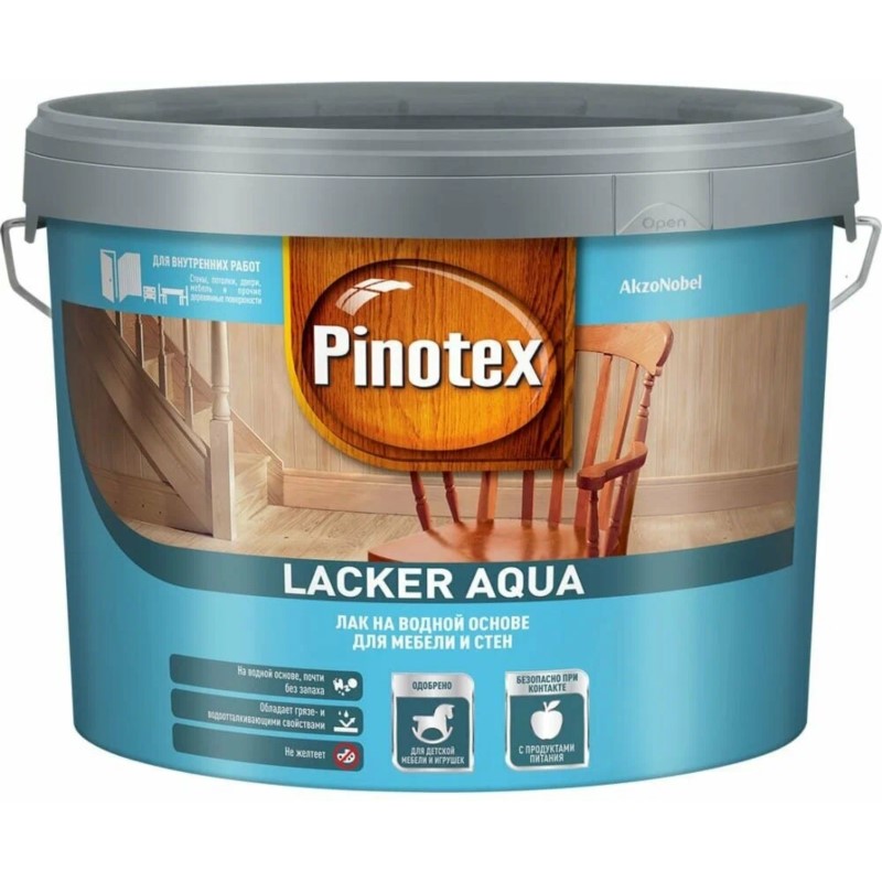 Лак на водной основе для дерева Pinotex Lacker Aqua одобрен для покраски детской мебели и игрушек, а также сертифицирован для лакирования деревянной посуды, безопасен при контакте с пищевыми продуктами. Для защиты от влаги и грязи можно лакировать минеральные поверхности (бетонные, кирпичные, каменные стены). Не применять для лакировки полов.