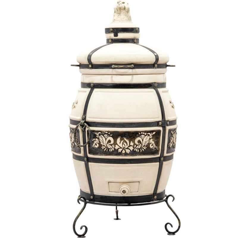Тандыр "Казачий" выполнен в виде округлого бочонка большого объёма. Тандыр имеет крышки двух уровней (колпачок и крышку). Удобно выполненный колпачок, позволяет не терять тепло при открывании тандыра. А крышка с удобными ручками позволяет легко открывать тандыр и закладывать в него продукты для приготовления. Кованная подставка - ножки обеспечивает удобное использование тандыра. Красоту тандыру придаёт интересный орнаментальный растительный узор, расположенный в центральной его части. Керамический тандыр в основном выполнен в бежевом цвете, коричневый цвет добавлен в области орнамента.