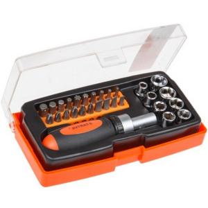 Комплект: отвертка реверсивная с магнитным наконечником (1шт), переходник 25мм (1шт), головки (8шт) 5-6-7-8-9-10-11-12мм, биты 25мм (19шт) SL4-5-6-7 / Hex4-5-6 / PH#1-#2-#3 / PZ#1-#2-#3 / Torx T10-T15-T20-T25-T30-T40;