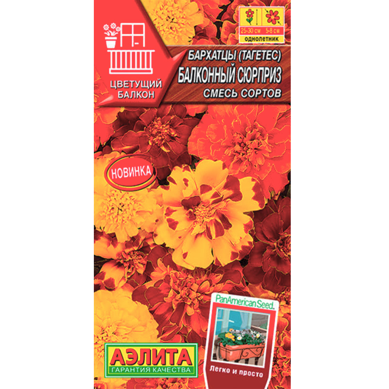 Бархатцы Балконный сюрприз, смесь окрасок - это cмесь американской селекции от компании PanAmerican Seed обеспечивает раннее цветение, крупные цветки и превосходную производительность в любую погоду. Растения формируют компактные однородные кустики высотой 25-30 см. В период массового цветения кустики полностью покрываются яркими соцветиями 5-8 см. Бархатцы великолепно украсят террасы, балконы и оконные ящики. В балконных ящиках расстояние между растениями 10-15 см.