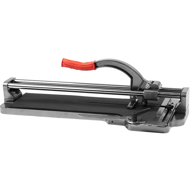 Для работы с керамогранитом и керамической плиткой повышенной толщины плиткорез оснащен ручкой, направляющими и литой платформой.