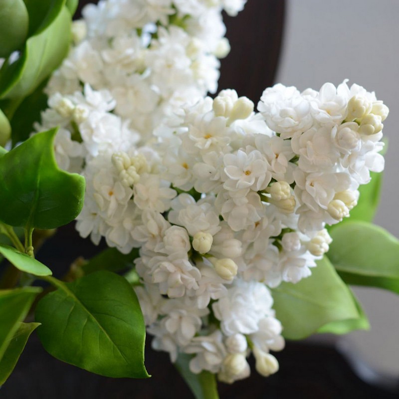 Бутоны кремовые. Цветки чисто-белые, крупные, диаметром до 3 см, махровые — из трех венчиков, с легким ароматом, лепестки овальные, приподнимаются и закрывают центр.