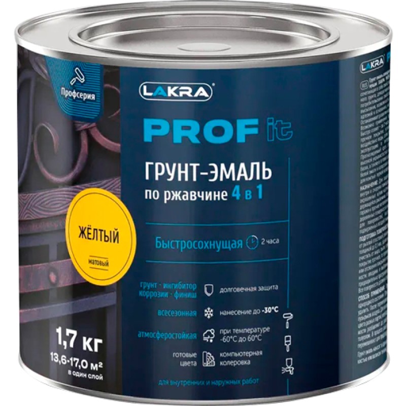 Атмосферостойкая гладкая грунт-эмаль «4 в 1», сочетающая в себе свойства преобразователя ржавчины, антикоррозионного грунта, декоративной эмали, а также обладающая передовыми потребительскими свойствами – нанесение до -30°С, быстрое время высыхания и возможность колеровки.
