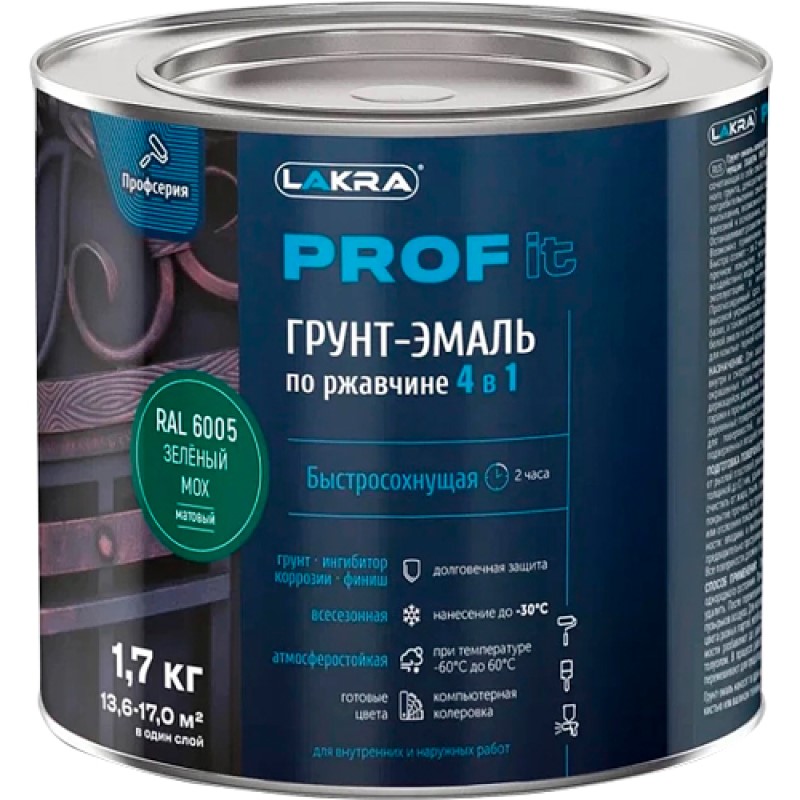 Атмосферостойкая гладкая грунт-эмаль «4 в 1», сочетающая в себе свойства преобразователя ржавчины, антикоррозионного грунта, декоративной эмали, а также обладающая передовыми потребительскими свойствами – нанесение до -30°С, быстрое время высыхания и возможность колеровки.