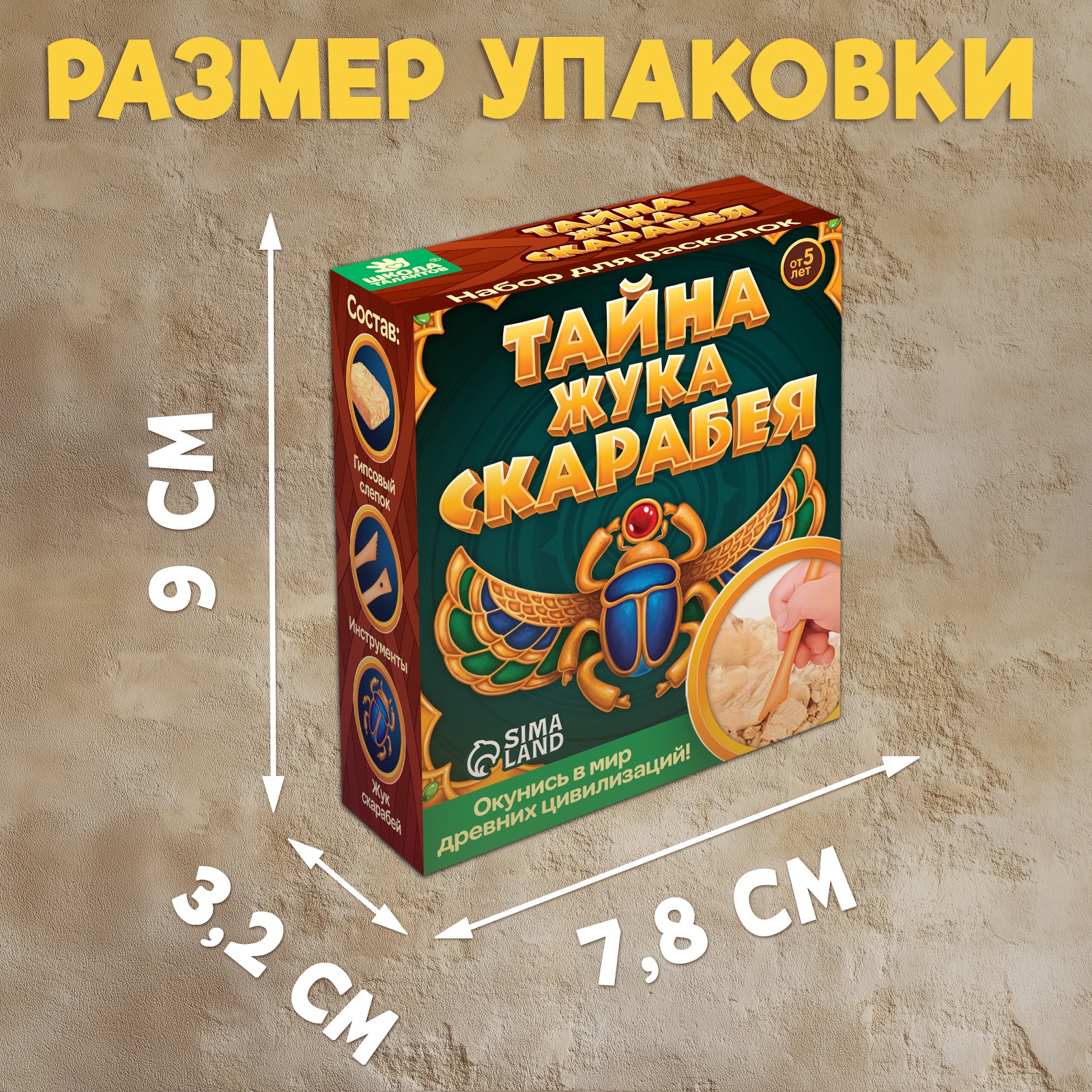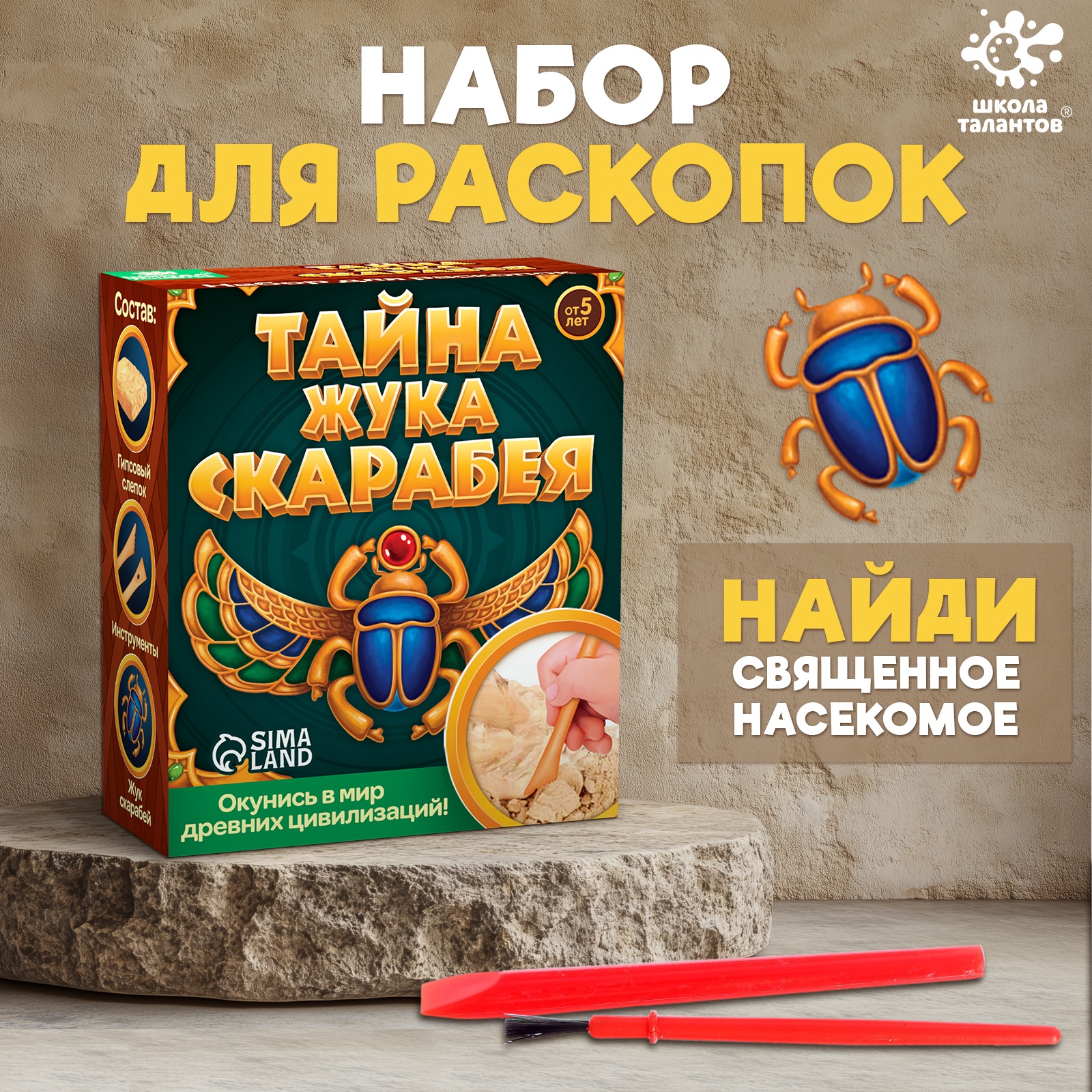 Юный археолог, исследуя гипсовый слепок, сможет отыскать спрятанного жука скарабея.