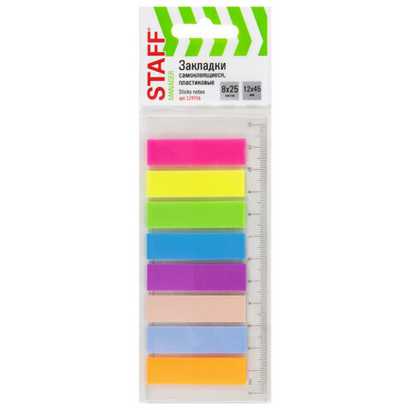 —Закладки клейкие "Staff" неоновые, пласт, 45х12мм 200шт 8цв. 129356