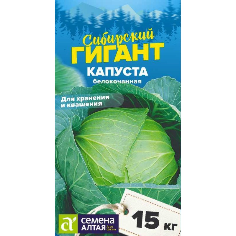 Серия Сибирский гигант – богатырский размер и богатый урожай. Позднеспелый (130-140 дней) урожайный сорт с крупными отборными  кочанами, которые при правильном уходе и соблюдении агротехники достигают массы 15 кг. Кочаны округлые или плоскоокруглые, выравненные, плотные, на разрезе белые, необыкновенно хороши для квашения. Вкусовые качества отличные, салаты из свежих кочанов сочные, сладкие, нежные и хрустящие. Сорт отлично хранится в течение 6-8 месяцев. Место посадки: плодородные рыхлые почвы с нейтральной реакцией среды. Лучшие предшественники — бобовые, тыквенные, картофель, морковь, лук Освещение: обильное, не выносит затенения Предпосевная подготовка: семена замачивают в 0,5% растворе марганцовки на 15 минут.