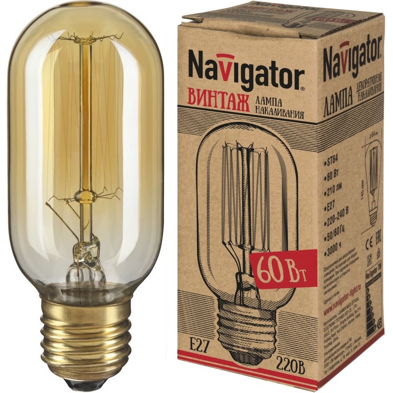 —Стандартная лампа накаливания Navigator T45 60Вт 230В Е27 Ретро Эдисон 71958