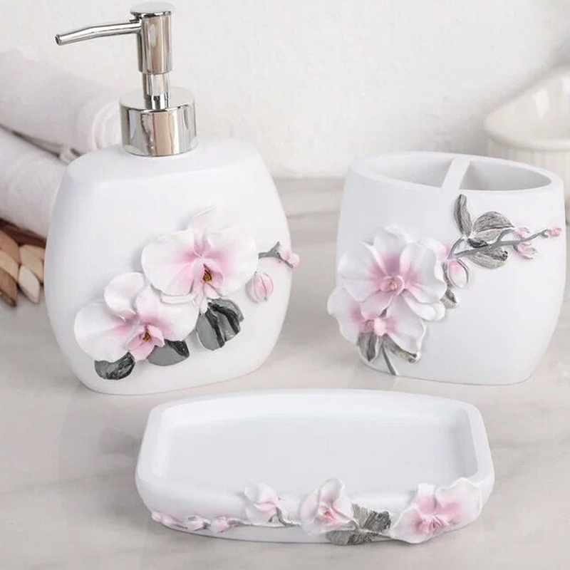 Набор для ванной "Орхидея" - этот комплект, состоящий из трех предметов, включает в себя мыльницу, дозатор для мыла и стакан, которые привнесут цветочную гармонию в ваш интерьер и сделают каждодневные ритуалы ухода за собой еще более приятными.