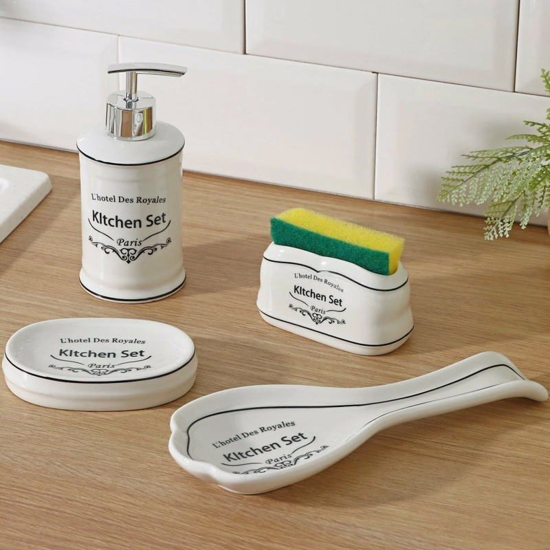 Набор аксессуаров для кухни организует пространство и станет стильным украшением вашей кухни. Набор состоит из 4 предметов: мыльница, дозатор, подставка для губки, подставка для ложки.