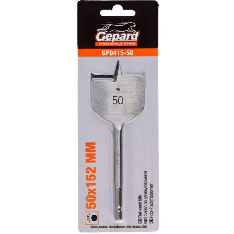 Сверло по дереву перьевое Gepard GP0415-50 с диаметром 50 мм и общей длиной 152 мм предназначено для сверления глухих и сквозных отверстий в мягкой и средней твердости древесине, а также в легких строительных материалах