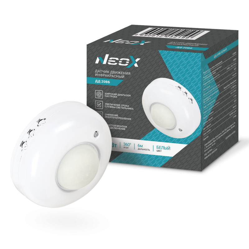 —Датчик движения инфрокрасный ДД 20ВБ 1200Вт 360гр 6м IP33 белый NEOX