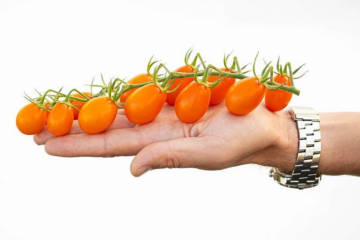 Необыкновенно яркий раннеспелый индетерминантный гибрид томатов черри. Первыми сладкими плодами вы сможете полакомиться уже через 90-95 дней после всходов. Первое соцветие закладывается над 8 листом, последующие через 2 листа. Междоузлия короткие. Полусложные кисти усыпаны, словно игрушечными, красивыми яйцевидными и грушевидными плодами янтарно-оранжевого цвета. На одной кисти до 30 двухкамерных плодов весом по 15-25 г. Томаты содержат большое количество каротина, ликопина и сахаров. Используются для свежего потребления, украшения фуршетных столов, а также для цельноплодного консервирования. Гибрид устойчив к фузариозному и вертициллёзному увяданию, бурой пятнистости, вирусу томатной мозаики. Плотность посадки – 3-4 растения/м2. Рекомендуем формировать в 1-2 стебля. Урожайность 12,0-13,0 кг/м2 в открытом грунте около 15,0 кг/м2 в защищенном грунте.