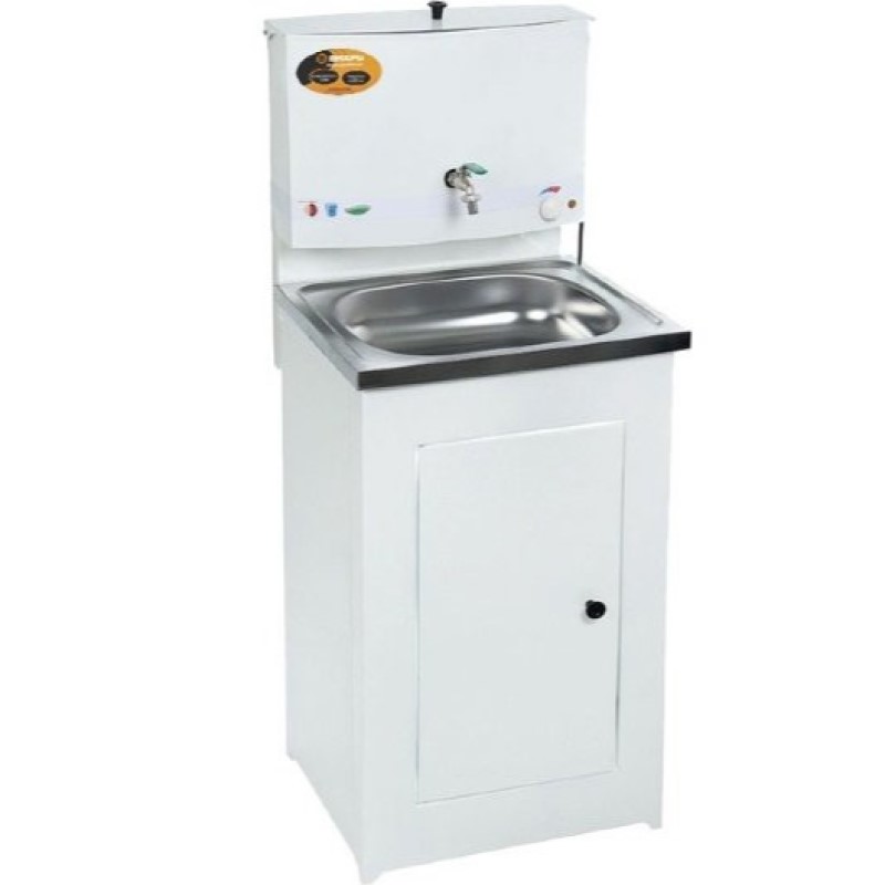 Бак оснащен водонагревательным элементом мощностью 1,3 кВт, с помощью которого всего за 40 мин можно получить 17 л горячей воды. Вам необязательно следить за временем, чтобы довести воду до необходимой температуры. Благодаря плавной регулировке установки режима нагрева, вы легко сможете выбрать оптимальный вариант для мытья рук, посуды, продуктов. Модель «Люкс» отличается наличием качественного металлического крана и привлекательным дизайном. Тумба с широкой дверцей позволяет скрыть внутри емкость для сбора отработанной воды или слив в канализацию. Вместительная пластиковая раковина пригодна для мытья посуды, временного размещения продуктов для мытья и обработки. Стильный умывальник нейтрального белого цвета отлично впишется в интерьер дачной кухни, террасы, а также может быть установлен в служебном помещении, на улице.