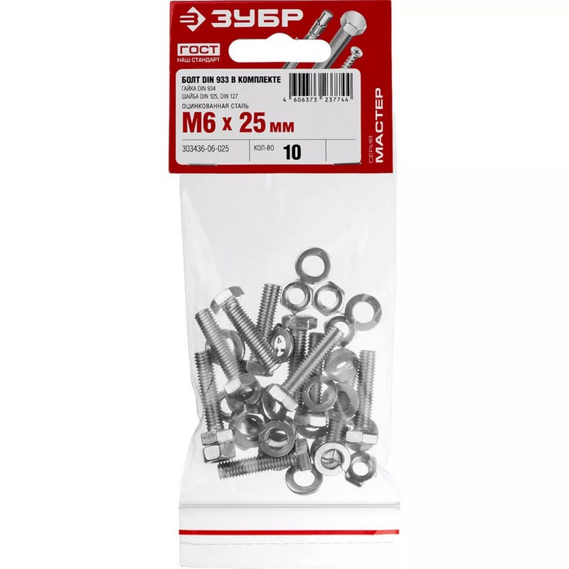 —Болт (DIN933) в комплекте с гайкой(DIN934),шайбой(DIN125),шайбой пруж.(DIN127),М6х25мм,10шт, ЗУБР