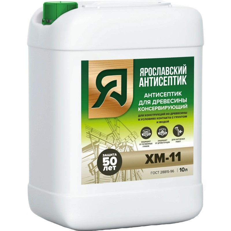 Антисептик ХМ-11 под торговой маркой «Ярославский антисептик» производится по ГОСТ 28815-96 «Растворы водные защитных средств для древесины» и предназначен для биологической защиты древесины от грибов (гниения, плесени, синевы) и насекомых-древоточцев при постоянном прямом контакте дерева с водой и грунтом. ХМ-11 особенно эффективен против почвенных грибов.