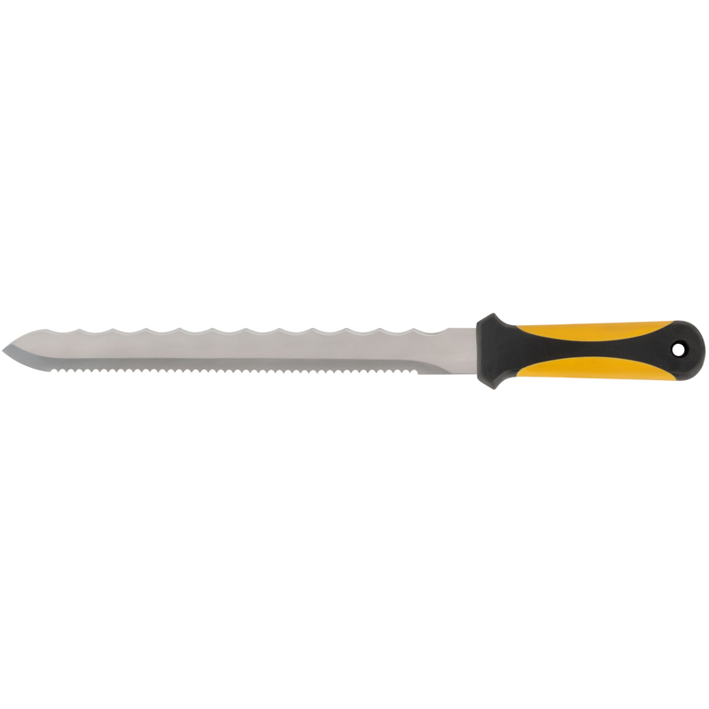 Нож для резки теплоизоляционных плит с двухсторонним лезвием предназначен для работ с плитами, изготовленными из пенополистирола, древесного волокна, минеральной ваты. Сторона с волнообразной заточкой предназначена для резки мягкой и гибкой изоляции, сторона с мелкими зубьями — для резки прочной и твердой изоляции. Специальная форма лезвия позволяет ножу легко входить в материал. Резиновые накладки на рукоятке предотвращают проскальзывание инструмента в руках во время работы.
