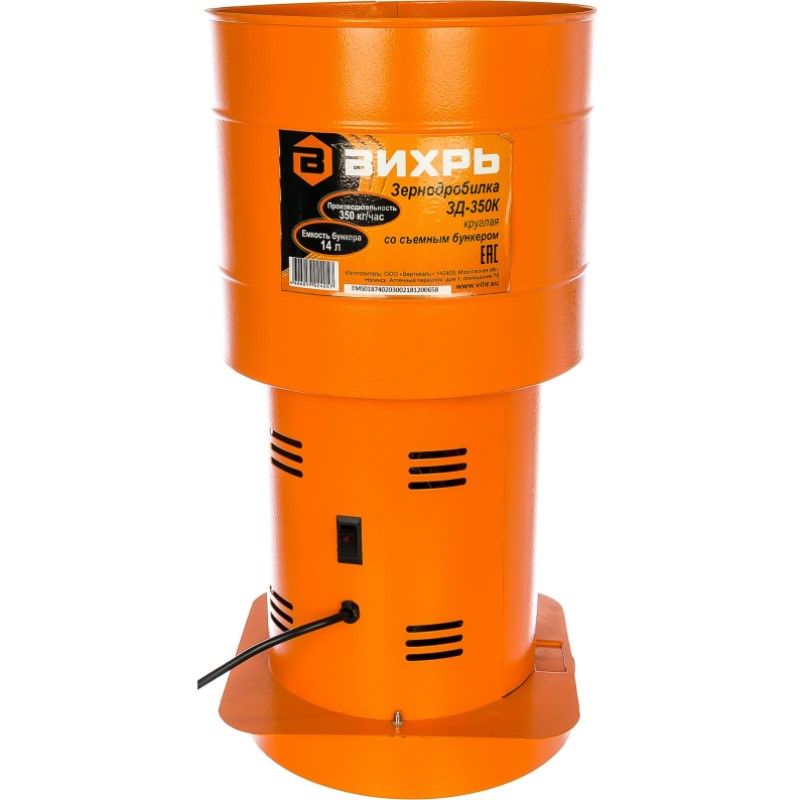 Принцип работы зернодробилки ВИХРЬ основан на измельчении зерна ножом и пробивании его через сито. Зернодробилка состоит из трех основных частей: загрузочная камера, моторный отсек и камера измельчения.