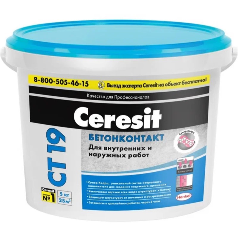 Грунтовка CT 19 Бетонконтакт предназначена для обработки гладких слабо впитывающих оснований стен из монолитного или сборного железобетона перед нанесением плиточных клеев, цементных и гипсовых штукатурок.