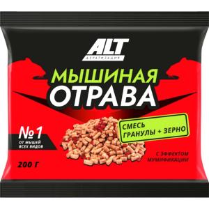Мышиная отрава от мышей всех видов №1 ALT, 100 г имеет вид привычного корма, не вызывает опасений у грызунов. Благодаря вкусовым добавкам поедаемость близка к 100% в связи с чем, смерть грызунов возможна после однократного поедания приманки. Так же хорошо работает против домовых мышей, черных и серых крыс, полевок.