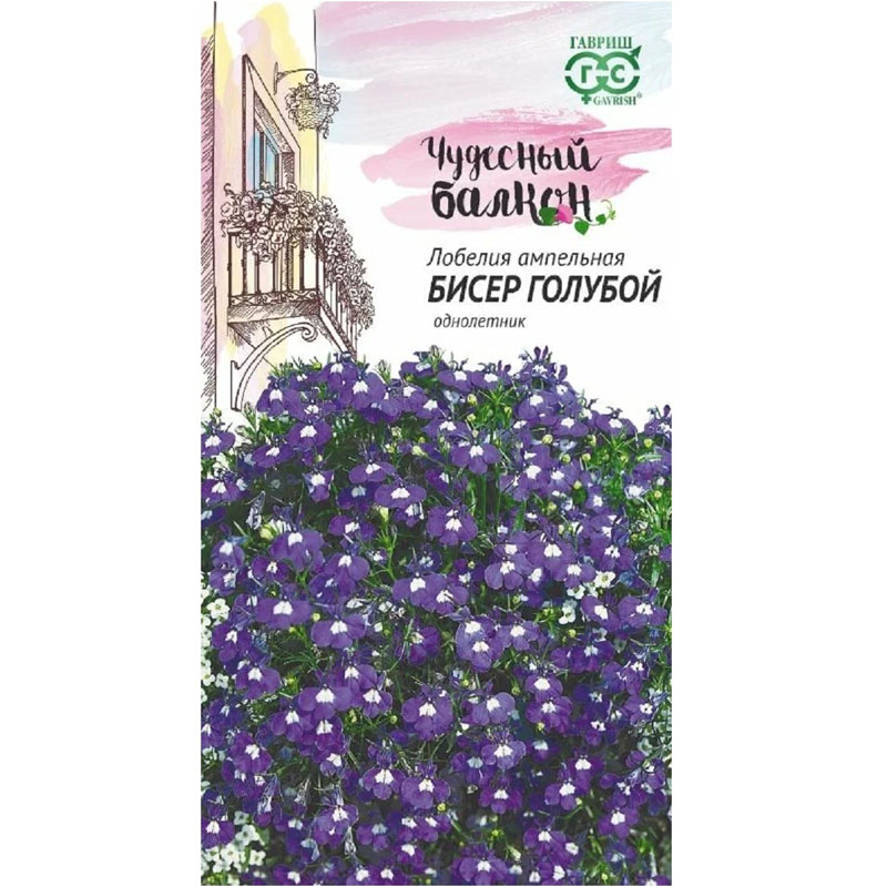 Семена Лобелии Бисер голубой, ампельная* 0,01 г сер. Чудесный балкон Лобелия — солнцелюбивое растение, но она прекрасно растет в полутенистых местах на балконах, которые выходят на северо-восток и северо-запад. Ее ниспадающие изящные побеги длиной до35 см, усыпаны небольшими, до1,5 см, двугубыми цветками, расположенными на коротких цветоножках в пазухах листьев. Цветет с июня по сентябрь. Цветки ярко-синие с белым глазком. Размножают семенами, посев которых проводят в феврале-апреле. Семена у лобелии мелкие, для равномерности посевов их смешивают с сухим песком в соотношении 1:50 и не заделывают в почву. Сверху посевы укрывают пленкой или стеклом. Всходы появляются через 9-10 дней. В мае растение рассаживают в вазы, кашпо, балконные ящики. Для обильного цветения необходимо своевременно обрезать отцветшие побеги.