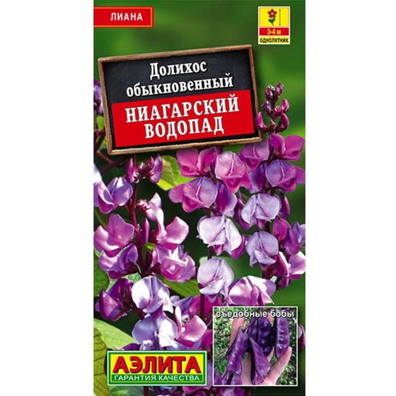 Долихос обыкновенный (кокорник) Ниагарский Водопад - красивая однолетняя лиана. Известна также как "вьющаяся сирень" . Густо облиственные стебли длиной 3-4 метра хорошо обвивают беседки, высокие изгороди, затеняют солнечные балконы. Интересно, что побеги плетутся против часовой стрелки. В пазухах листьев образуются длинные кисти ароматных мотыльковых цветков – до 40 шт. в соцветии. Период декоративности каждой кисти три недели, а все растение обильно цветет до заморозков. На смену цветкам появляются плоские фиолетовые бобы, которые еще более украшают лиану. Молодые бобы долихоса пригодны в пищу, а соцветия – на срезку. Перед посевом семена долихоса замачивают или скарифицируют (нарушают твердую семенную оболочку) и высевают на рассаду в отдельные горшочки. Долихос – растение теплолюбивое. Предпочитает хорошо прогреваемые солнечные участки с плодородной, некислой почвой. Необходима подвязка к опоре.