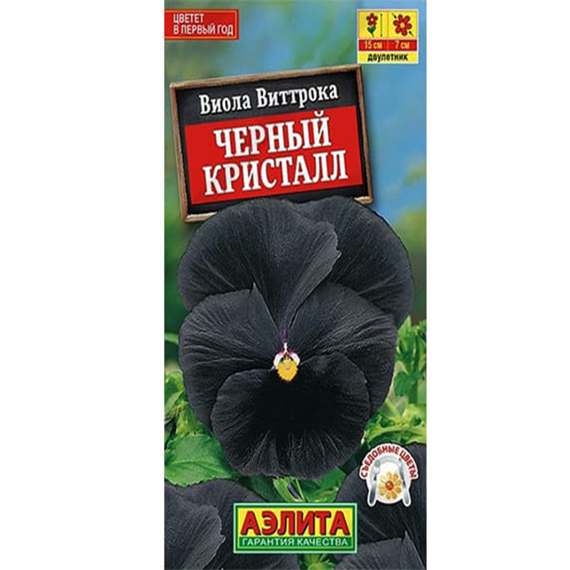 Семена Виола Черный кристалл. Эффектный, редкий сорт с неповторимой бархатисто-черной окраской цветков. Густые и компактные кустики высотой до 15 см, обильно усыпаны крупными цветками диаметром  6-7 см. Цветение продолжительное. Растения холодостойкие, неприхотливые. Используются в контейнерном озеленении, для ковровых посадок в бордюрах, на клумбах и переднем плане цветников. Отлично оттеняют «анютины глазки» любого цвета, привлекают бабочек, пчел и шмелей. Бутоны и цветки съедобные, их используют для украшения блюд.