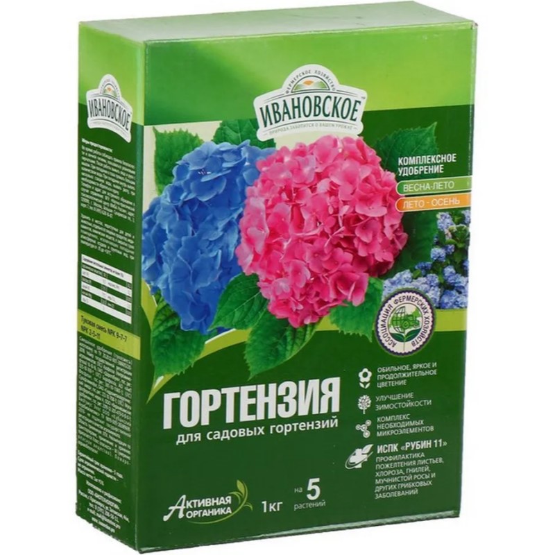 Многокомпонентное комплексное удобрение предназначено для основной подкормки гортензий в весенне-летний и осенний периоды. Способствует формированию мощной  корневой системы, увеличивает число бутонов и продолжительность цветения. Входящий в состав удобрения дополнительный комплекс для внекорневых подкормок ИСПК «Рубин 11» улучшает сопротивляемость к опасным болезням и устойчивость к неблагоприятным погодным условиям, влияет на изменение  цвета гортензий.