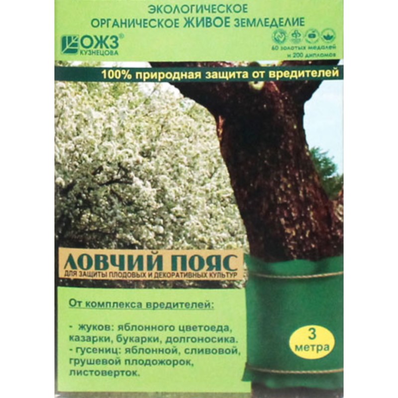 Ловчий пояс – это полностью безопасное и удобное в употреблении средство. Установленный однократно, он долгое время сдерживает вредителей, которые пытаются забраться в крону по стволу. Ловчий пояс состоит из ленты, на которую нанесен специальный энтомологический клей.