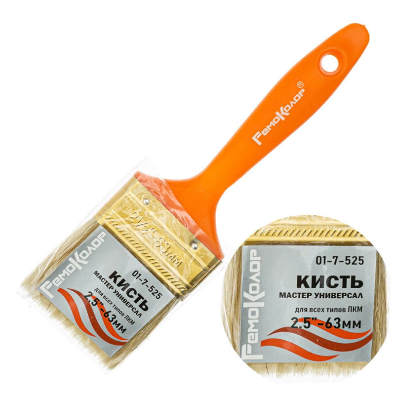 Кисть флейцевая РемоКолор ГАММА УНИВЕРСАЛ 63мм (2,5 дюйма) имеет натуральную светлую щетину. Пластиковая рукоятка неокрашенная и имеет отверстие для подвешивания.  Характеризуются хорошей краскоотдачей, износоустойчивы и обладают способностью равномерно распределять краску по поверхности. Устойчивы к воздействию сильных растворителей. Упругость щетины обеспечивает сохранность формы. В состав входит свиная щетина, имеющая чешуйчатую и шероховатую поверхность.  Щетина имеет коническую форму с естественным расщеплением на конце в виде метелочки. Такое строение щетины обеспечивает отличный забор и хорошее удержание краски на инструменте. Используется для красок на масляной основе, олифы, лаков, масляных лаков и древесных масел.  Наполняемость щетины на кончике кисти (TOPS) 60%.