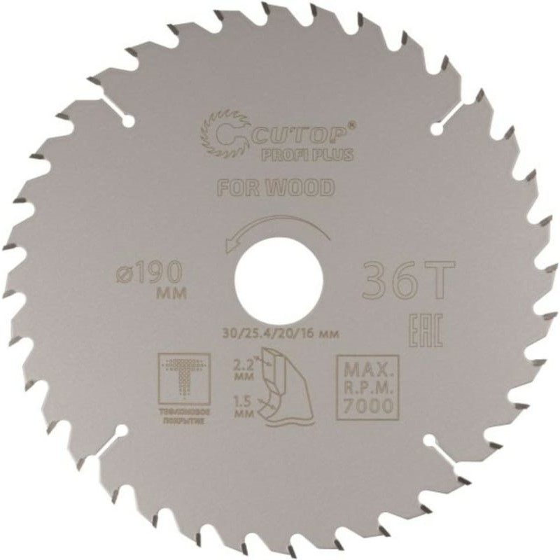 Диск пильный с тефлоновым покрытием по дереву 36Т,CUTOP Profi plus,190*1,5/2,2*30/25,4/20/16мм